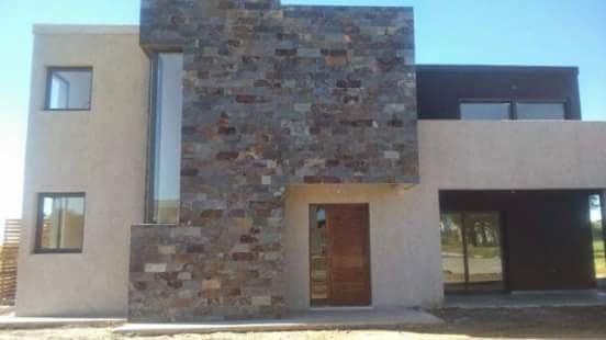 El revestimiento exterior de la casa fue realizado con lajas, un material natural que aporta una estética rústica y elegante. Las lajas fueron cuidadosamente seleccionadas y colocadas para garantizar una terminación uniforme y duradera. Este revestimiento no solo mejora la apariencia de la vivienda, sino que también ofrece beneficios como: