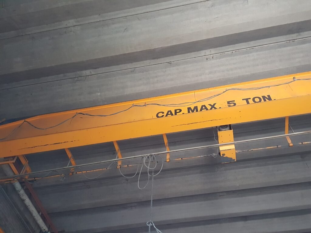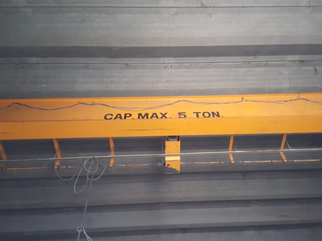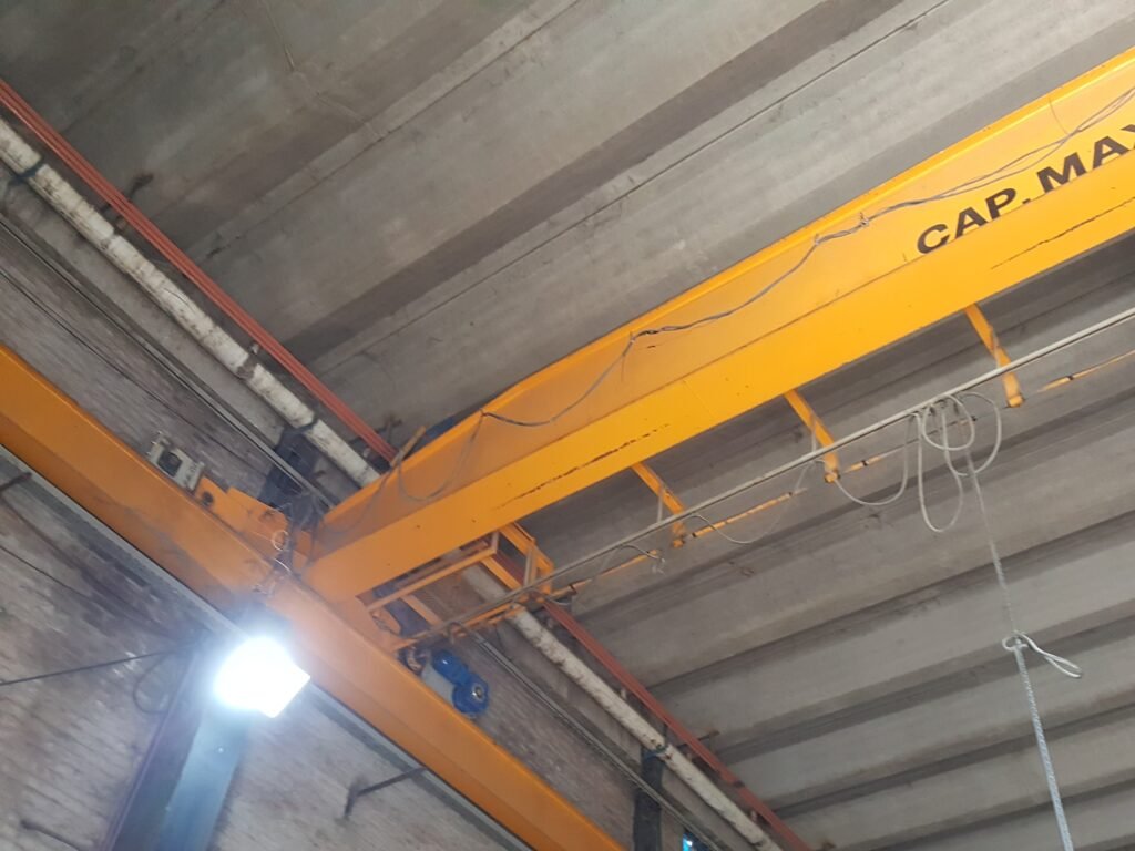 Este puente grúa tiene una capacidad de 50 toneladas y desplazamiento doble (longitudinal y transversal), lo que permite cubrir grandes áreas operativas dentro del galpón. Su uso está destinado a carga de maquinaria, estructuras metálicas y componentes pesados, facilitando los procesos productivos y reduciendo tiempos de operación.